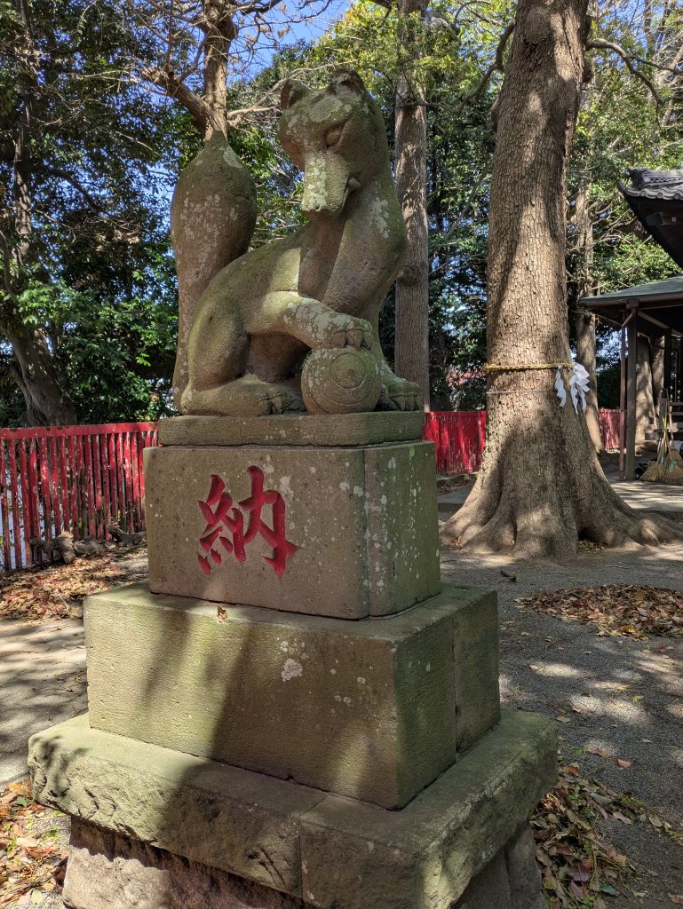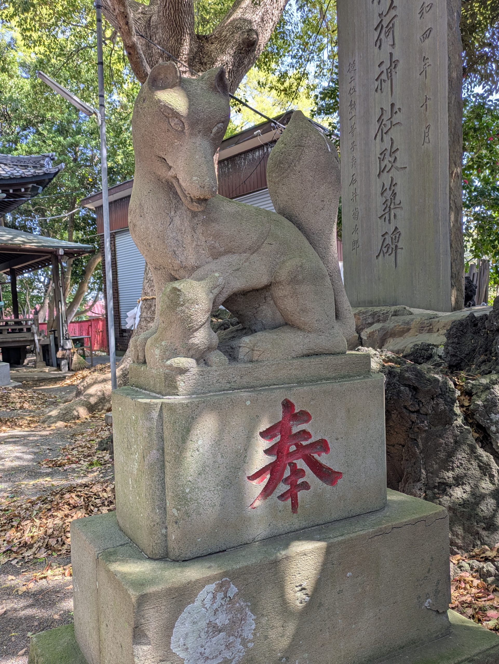 狐は穀物を食い荒らすネズミを捕食すること、狐の色や尻尾の形が実った稲穂に似ていることから、狐が稲荷神の使いに位置付けられました。神仏習合の時代には、稲荷神は仏教の 荼枳尼天(だきにてん)と習合されるようになりました。荼枳尼天は、日本では白狐に乗る福徳の神として親しまれています。社殿に向かって右側が雌で子ぎつねを抱いています。左側が雄で米俵を抱えています。